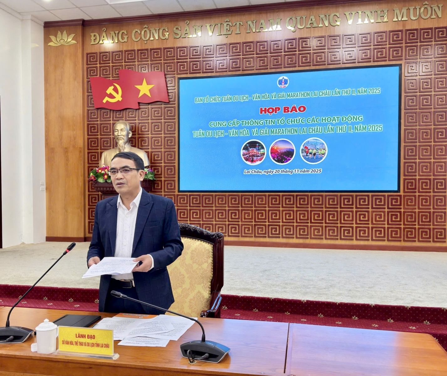 Sáng nay (20/11), Ban Tổ chức Tuần Du lịch - Văn hóa Lai Châu năm 2025 đã tổ chức Họp báo cung cấp thông tin về Tuần Du lịch - Văn hóa và Giải Marathon Lai Châu lần thứ II, năm 2025. Đồng chí Lưu Hồng Phương - Phó Giám đốc Sở Văn hóa, Thể thao và Du lịch, thành viên Ban Tổ chức chủ trì Họp báo.
