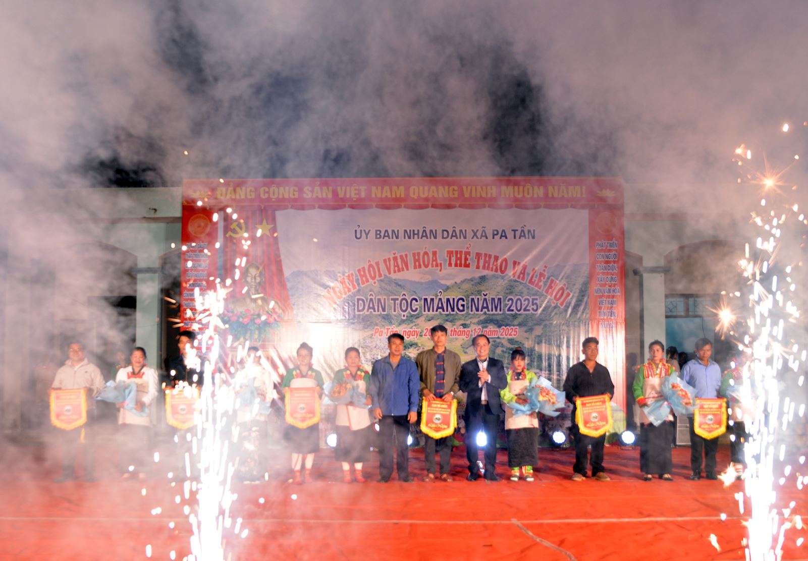 Lãnh đạo xã Pa Tần trao cờ lưu niệm cho các đội tham gia ngày hội
