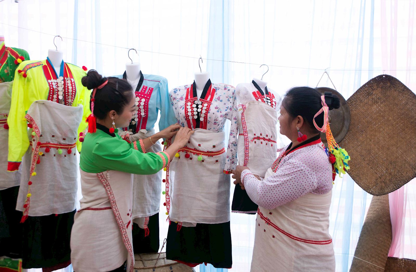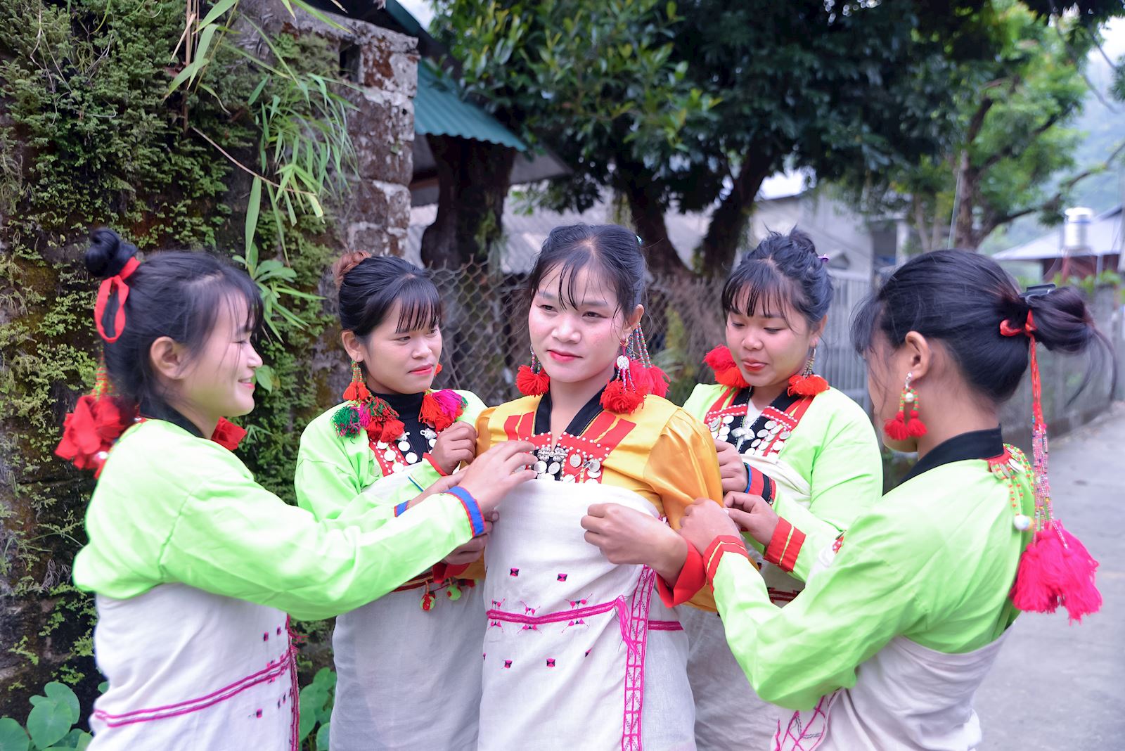 Các cô gái Mảng chỉnh trang trang phục truyền thống trước giờ thi lễ hội