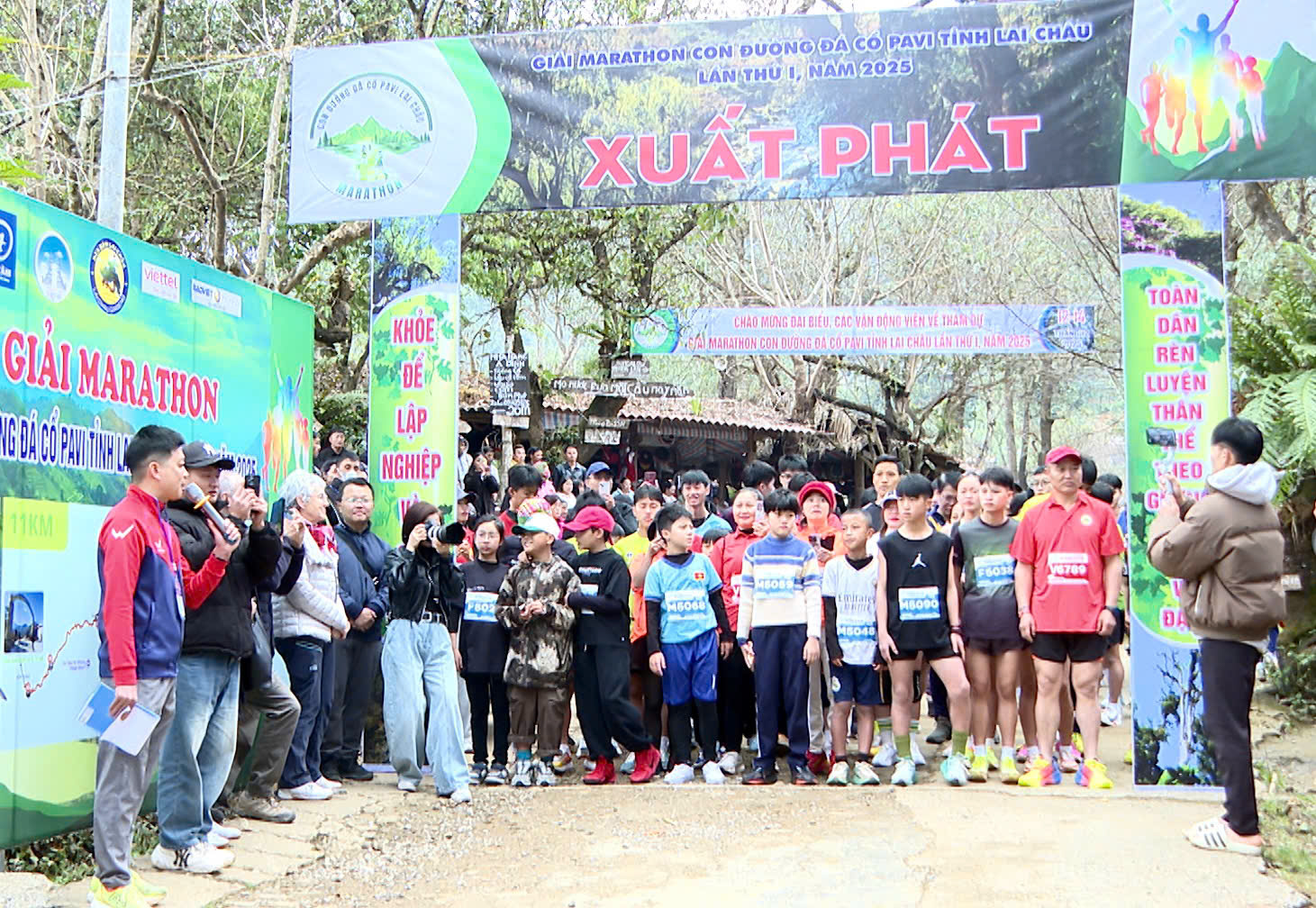 Các vận động viên tập trung tại khu vực xuất phát ở bản Sin Suối Hồ, xã Sin Suối Hồ, sẵn sàng bước vào tranh tài Giải Marathon Con đường đá cổ PaVi.